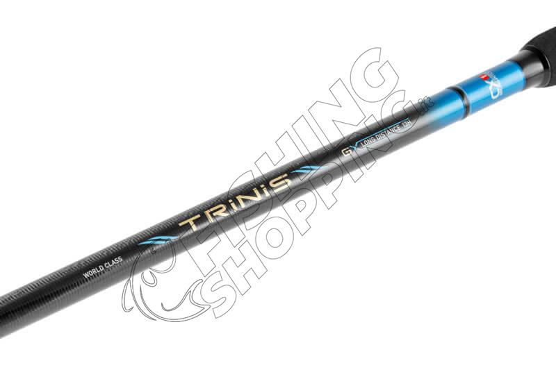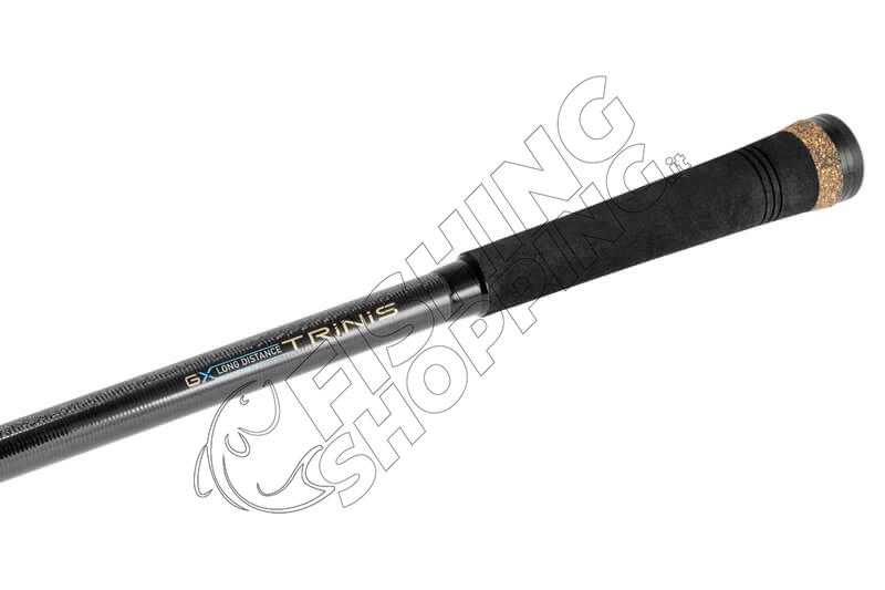 The NEW TRABUCCO TRINIS GX LONG DISTANCE FEEDER FISHING ROD features blanks made of CX1 Micro Pitch High Modulus carbon, offering a progressive parabolic action thanks to the X-Joint technology applied on all joints . The Twist Free technology, positioned on the base in the area of ​​maximum thrust, is essential for improving casting precision. With a Long Distance action and a maximum casting of 130 grams, this rod is optimized to reach considerable distances. The split handle design includes a graphite screw reel seat with side holes for effective blank contact, secured between a short EVA front grip and a non-slip rubber rear grip. The tapered EVA bottom grip features the laser-etched Trabucco logo, giving it a distinctive touch. The rod is supplied with 3 interchangeable carbon tips, protected in a dedicated tube. The double-shank SeaGuide SiC guides with tangle-free K-frame complete the equipment of this high-performance fishing rod.